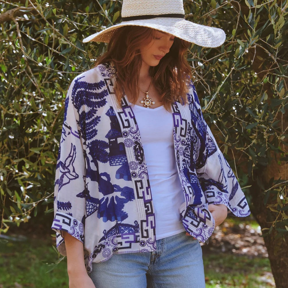 One Hundred Stars Giant Willow Kimono in Blue features the classic blue and white willow print which can often be found adorning vintage pottery.