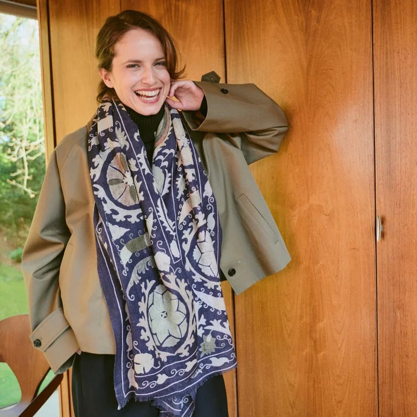 A bold oversized pattern inspired by traditional Susani needlework throws. Originating from East Asia made by embroidering a chain stitch pattern to a cloth base. Taupe and khaki chainstitch on a flat charcoal background give a subdued look to this bold print.