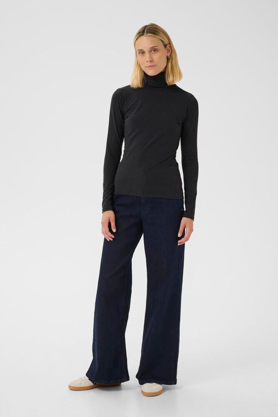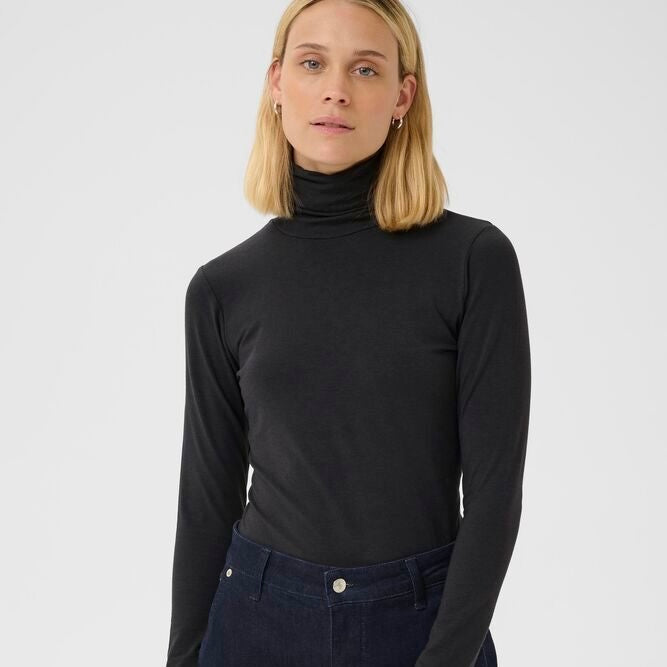 This long-sleeved turtleneck in soft black jersey fits closely to the body, offering a simple and elegant look.