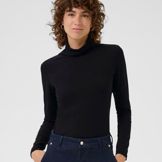 This long-sleeved turtleneck in soft black jersey fits closely to the body, offering a simple and elegant look.